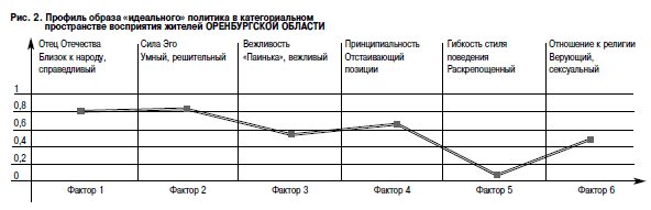 Профиль «идеального» политика стремится к максимально возможным показателям по осям первых двух факторов и четвертого. «Идеальный» политический лидер видится оренбуржцам включающим интересы своего отечества в круг своих жизненных целей. Это человек справедливый и решительный. Он умен, корректен, смело отстаивает свои позиции.
