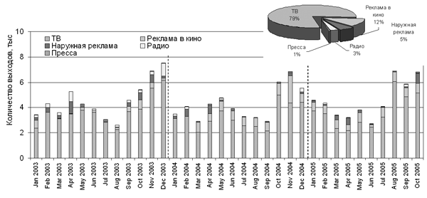 В течение периода январь 2003-октябрь 2005 гг. в средствах массовой информации вышло 151,9 тысячи рекламных сообщений в категории «Растворимый кофе». Лидером по этой позиции явилось телевидение: на его долю пришлось 120,06 тысяч рекламных сообщений — 79% всего количества. Второе место по выходу рекламных сообщений принадлежало рекламе в кино: 18,08 тысяч. На третьем месте наружная реклама: за анализируемый период наблюдалось 8,2 тысячи конструкции с рекламой растворимого кофе. Четвертое место занимала радиореклама: в эфире центральных радиостанций мы могли слышать 4,8 тысячи роликов. Пресса с количеством рекламных сообщений 799 по количеству выходов находилось на пятом месте (рис. 3).