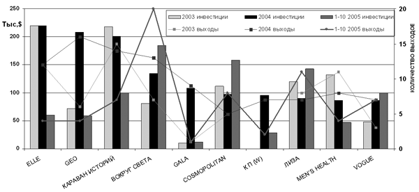 Рис. 6. Распределение рекламных инвестиций (левая ось) и количества выходов (правая ось) рекламы между изданиями (топ – 10) за весь исследуемый период (ранжировано по инвестициям за 2004 год)