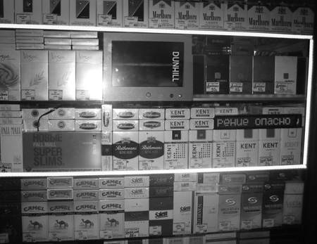 На рис. 1 мы видим микс из доступных рекламных средств в рамках табачной палатки. Здесь присутствует световой POSM, светодинамический посм, яркая флуоресцентная полоса; лайтбокс, который работает на представление конкретной марки, shelf-Т/ — для более дорогой группы товара.