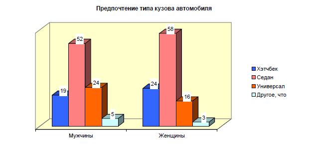 По результатам исследования выявилось, что большая часть потенциальных покупателей автомобилей - молодёжь до 35 лет, среди которой много девушек (87%), причём водительский стаж у 81% женской части респондентов не более 3 лет. Это вполне согласуется со статистикой ГИБДД, по которой в нашем городе около 80% обучающихся в автошколах - женщины.