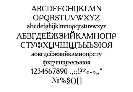 Рис. 8. Академическая гарнитура (нормальное начертание) — типичный шрифт начала века, основанный на рисунках шрифта Сорбонна фирмы Бертольд, который, в свою очередь явился вариацией популярнейшего шрифта Бентона — Челтэнхем. Старостильная форма ряда знаков, напоминающая шрифты XVIII века, создаёт характерный исторический образ.